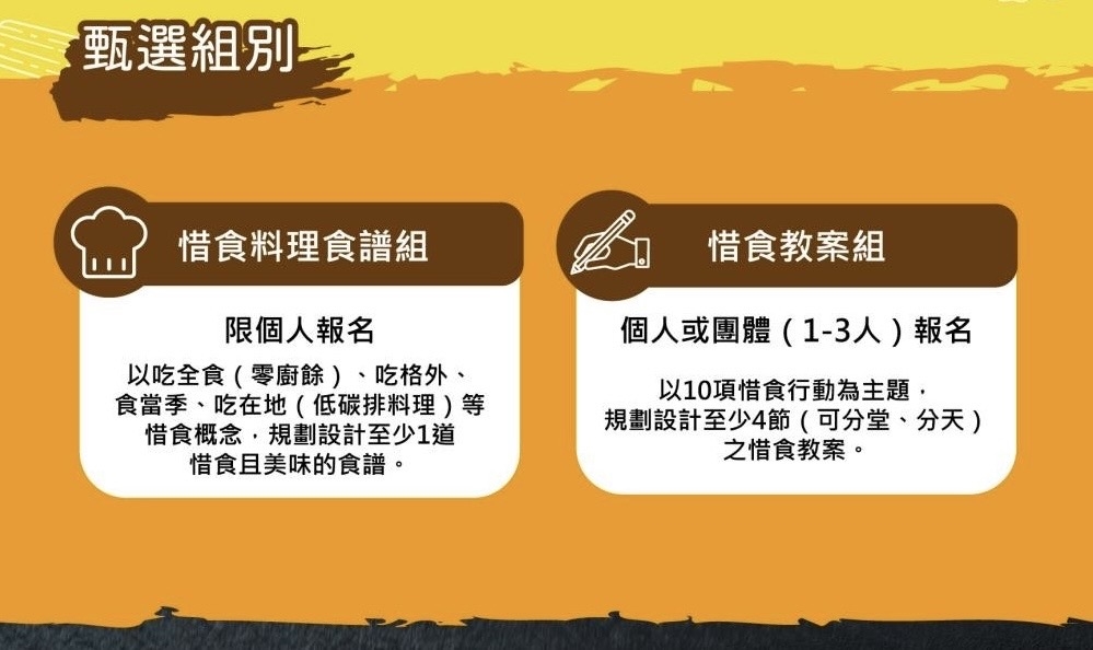 競賽分「惜食料理食譜組」及「惜食教案組」,凡設籍、居住或就學(業)於苗栗縣即可參賽,強力徵求本縣首「惜」料理人,發揮創意,把十大惜食行動「主動說、可以選、可打包、吃格外、吃全食、吃在地、惜食材、愛地球、愛分享、愛推廣」,透過創意及巧思製作成「美味食譜」或運用創意思維及教學方式提出「創意教案」。