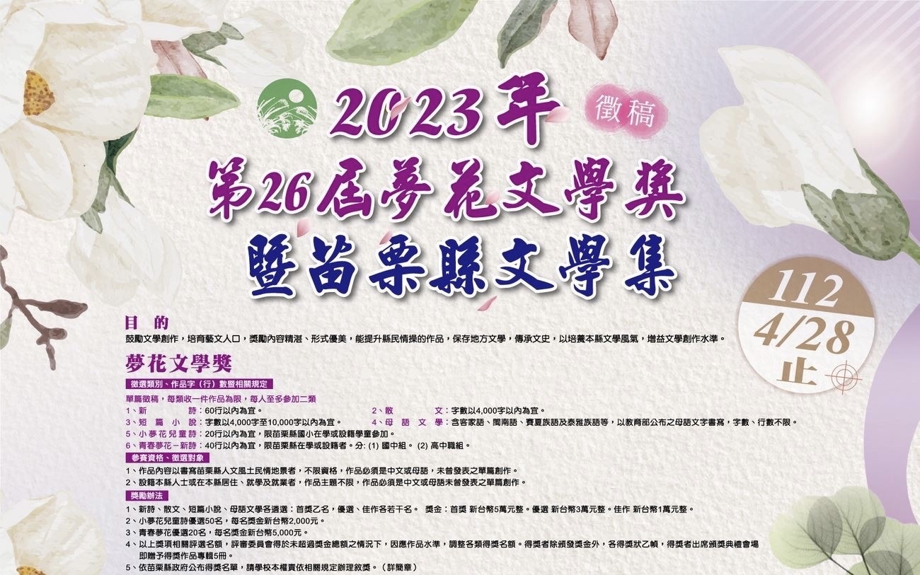 每年一度「苗栗第26屆夢花文學獎暨苗栗縣文學集」徵選,截稿期限至4月28日,目前已陸續接獲各界送件及詢問相關投稿事宜;苗栗縣政府籲請各界寫作高手,把握此次難得的機會,踴躍投稿送件一試身手。
