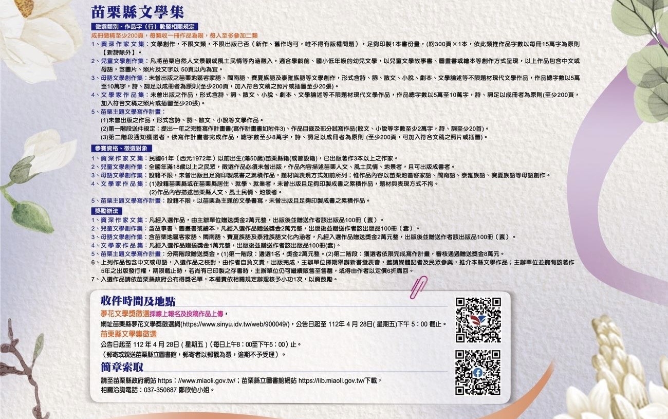詳情請上苗栗縣立圖書館網站https://lib.miaoli.gov.tw/查詢公告簡章,或洽詢電話:037-350887鄭欣怡小姐。