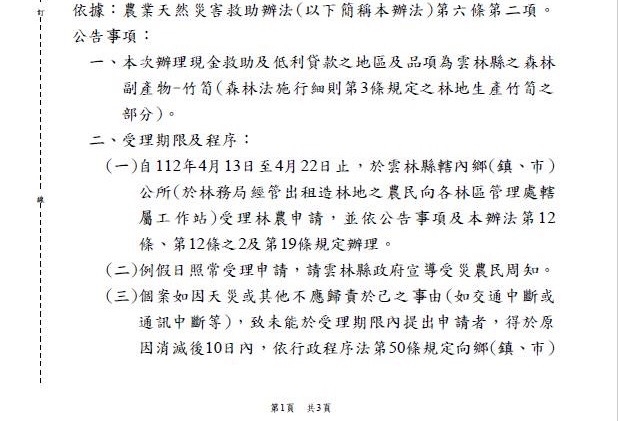 經農委會快速作業後,在今(12)日公告「森林副產物-竹筍」為辦理112年2-3月乾旱農業天然災害現金救助及低利貸款地區,時間自112年4月13日至4月22日止,於雲林縣轄內(鄉鎮市)公所(於林務局經管出租造林地之農民向各林區管理處轄屬工作站)受理林農申請。劉建國呼籲,有需要的農民都可以盡速提出申請。
