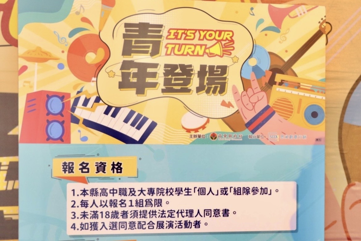 今年規畫辦理的「青年登場 I t,s Your Turn」青年學生才藝徵選及展演活動,除放寬了徵選對象條件,不再限於參與各校社團的學生,只要是苗縣高中職或大專院校的學生皆可報名參加,而且後續的展演活動亦改變模式,由入選青年與縣府一同合作規畫展演主題,給予學生策畫舞台表演內容的主動權。