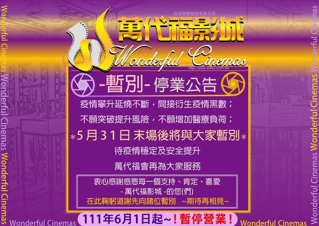萬代福影城官網於5月19日的貼文「萬代福小記」,似乎已預告將暫停營業了。「萬代福小記」內文:「疫情不恐怖、確診也不可怕!該憂的是抹殺努力重生的標籤評論⋯該懼的是諸多不安衍生的疏離冷漠⋯該愁的是如何維持應變未知的衝擊⋯萬代福清楚留存是需要人潮的累積;萬代福明白群聚是突破安全的風險;留與捨,兩難之下...選了捨...安與危,兩端之中...捨了危...承受、拚搏、扭轉、撐熬、矛盾、擔憂...都經歷了~也努力了~更盡力了~」