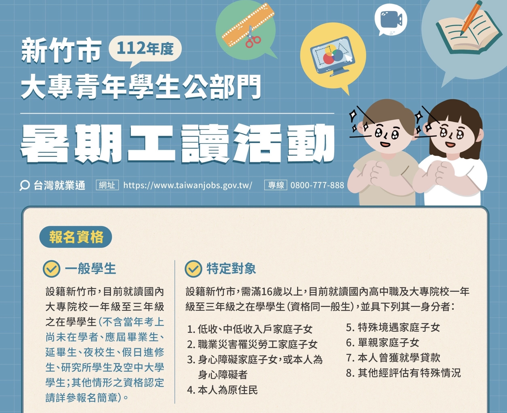 勞工處說,今年暑期工讀期程自7月3日至8月24日止,一般大專學生工讀名額96名,為照顧弱勢學生族群,還有特定對象學生工讀名額7名,共計提供103個工讀職缺。受理報名後,5月15日(一)公布「符合資格名單」於新竹市政府勞工處網站(dep-labor.hccg.gov.tw/)。
