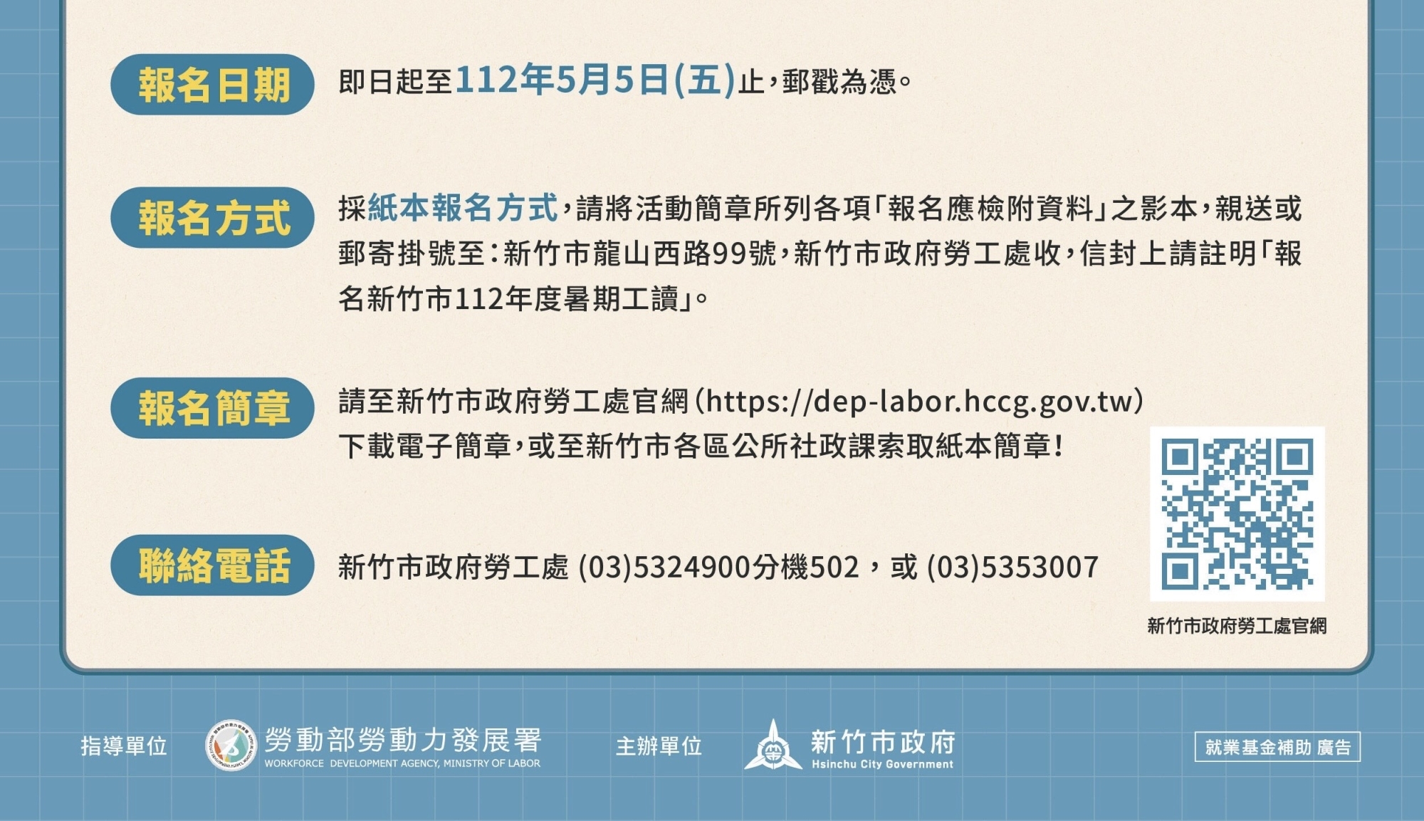 詳細工讀報名資格及申請條件,請至竹市府勞工處網站下載活動簡章及報名表件,或至各區公所社政課索取紙本報名簡章。填妥報名表並檢附相關證明文件後,於5月5日(五)報名截止前,以郵戳為憑,親送或掛號郵寄至勞工處(地址:300新竹市龍山西路99號,新竹市政府勞工處收),在信封上註明「報名新竹市112年度暑期工讀」。