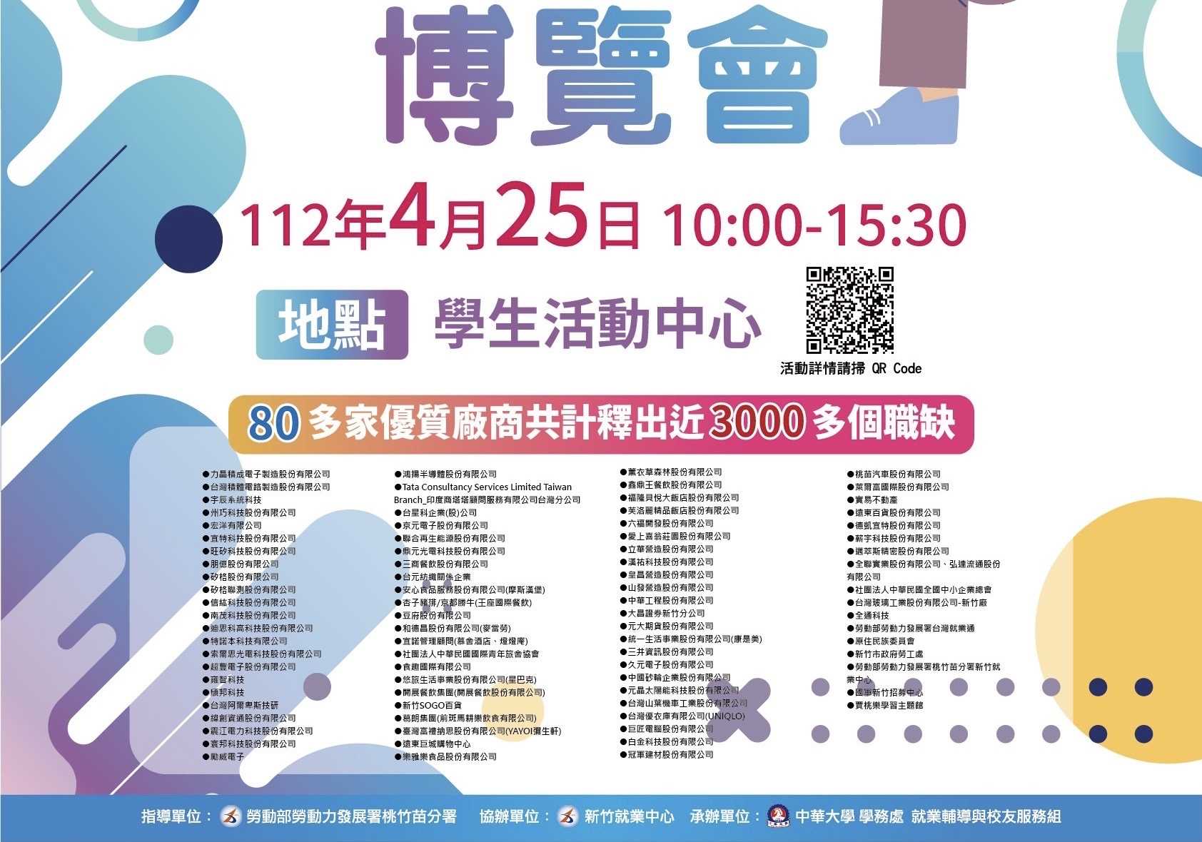 為協助學生畢業後順利就業,竹市今112年第4校園徵才博覽會25日在中華大學登場,參與企業逾100家,總計提供逾4,000個工作機會。