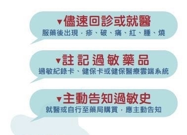 三、主動告知:有用藥過敏史的民眾,無論是就醫或自行至藥局購買藥品時,應主動告知,或提供「過敏紀錄卡」,方便提供醫療人員做參考,以免誤用過敏藥品。