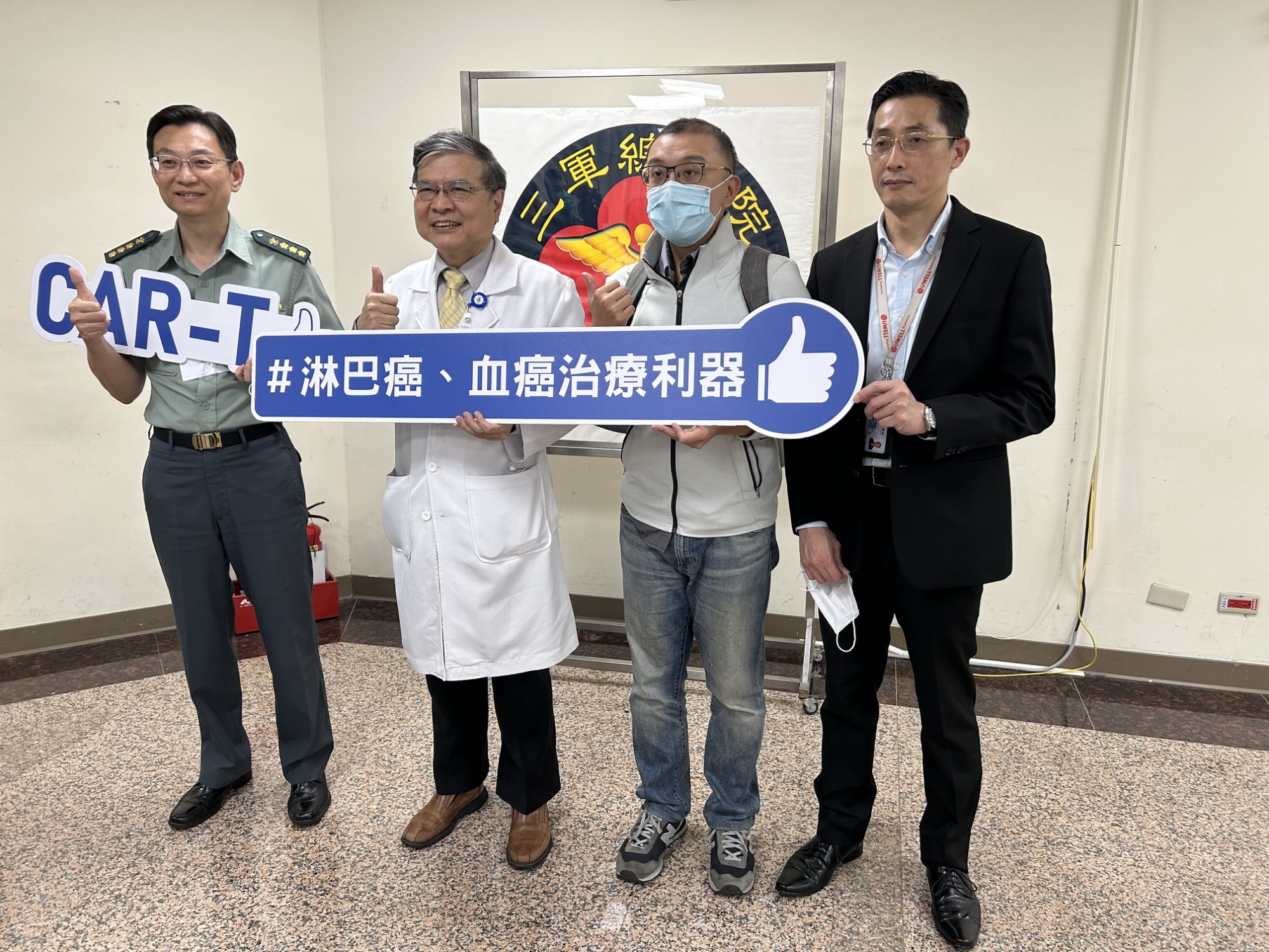 左起三總政戰主任周濟寒上校、血液腫瘤科陳宇欽主任、病友張先生、宇越生醫郭正宜博 圖∕三總醫院