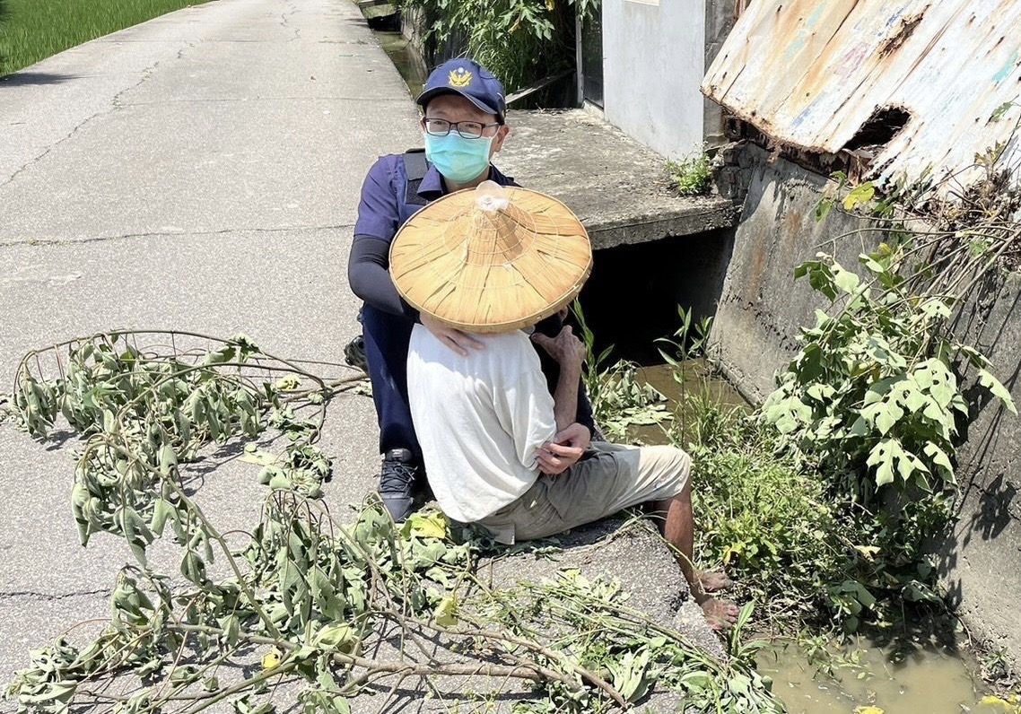 員警到場後見一名老翁半身已陷於水溝內,時因天氣酷熱老翁已全身無力、精神恍惚,副所長李益昇擔心該民老翁有生命危險,協同警員陳俊瑋合力將老翁從水溝救起。