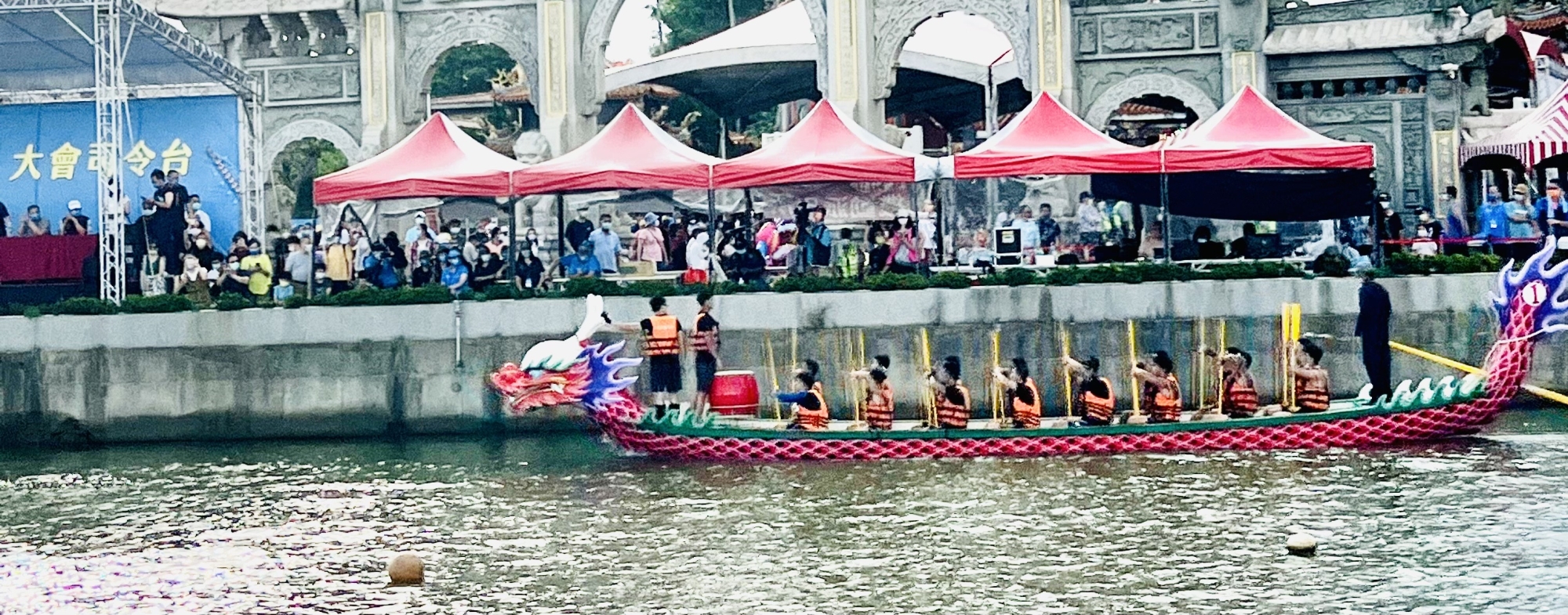 五月五鬧端午,熄鼓兩年的新竹縣龍舟賽,(三)日在新竹縣新豐鄉池和宮起鼓,重燃戰火捉對廝殺,其中龍舟隊伍奪標後,返回起點交替通過司令台,選手們定坐舉漿敬禮場景,最讓小朋友觀眾好奇!