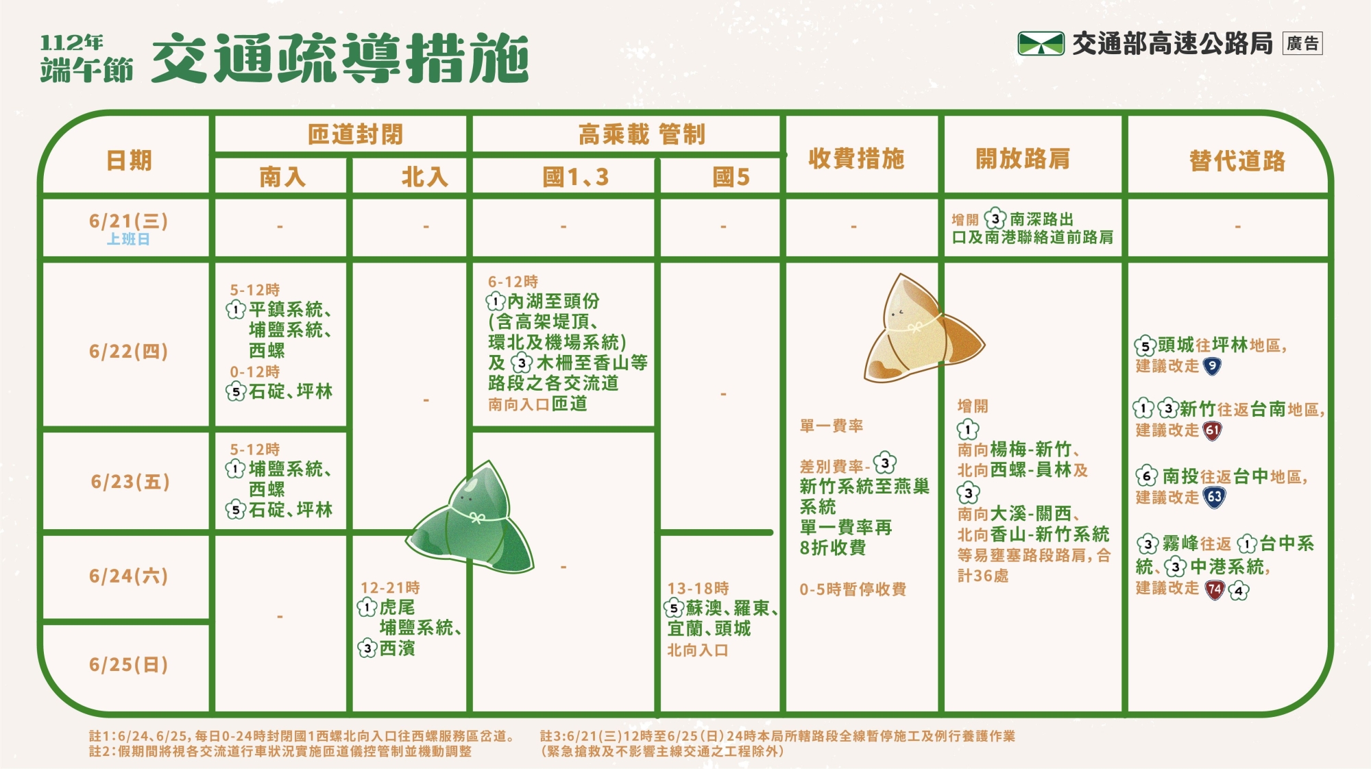 112年端午連續假期(112/06/22-112/06/25)計4天,預期各地將出現大量旅遊車潮,為維持高速公路行車合理服務水準,高公局透過大數據分析國道易壅塞時段及路段,於端午連假期間實施國道交通管制措施,並視新冠疫情發展滾動檢討相關疏導措施: