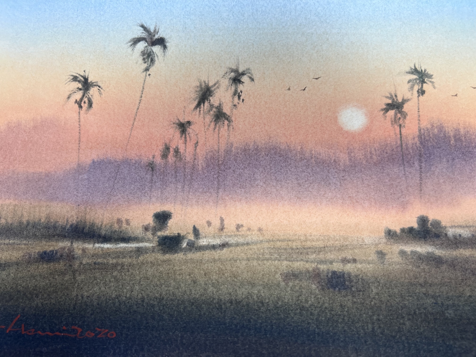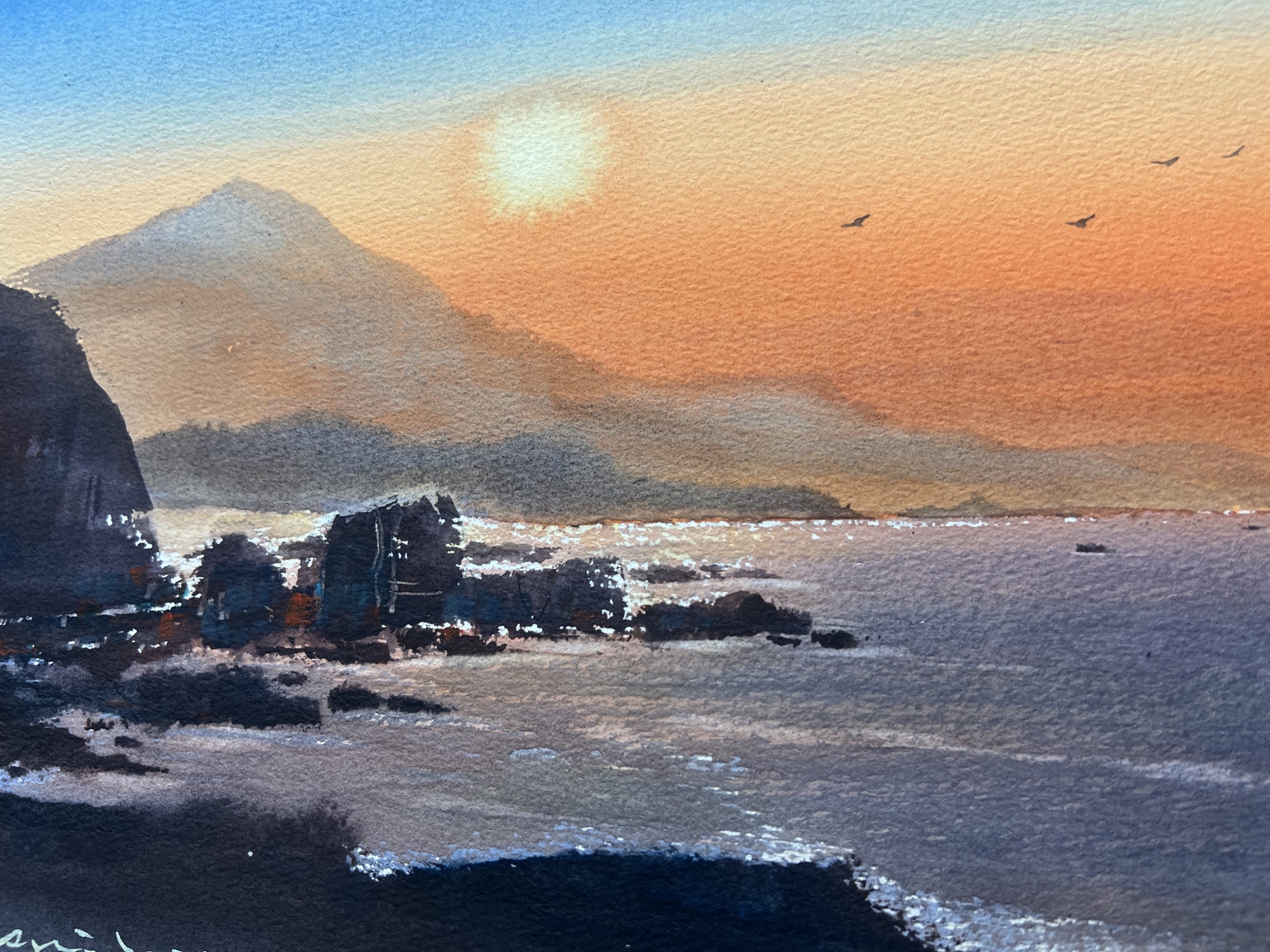 狂風暴雨中或是滿天星辰,他獨自經歷過,也出現在東方第一道曙光來臨時刻,天海一線日落晚霞,是溫進燻老師的最愛,在這段緊挨時辰裡,有太多變化撥動色彩活力,為不停激盪繪畫創作,指點出與眾不同綺麗畫面。
