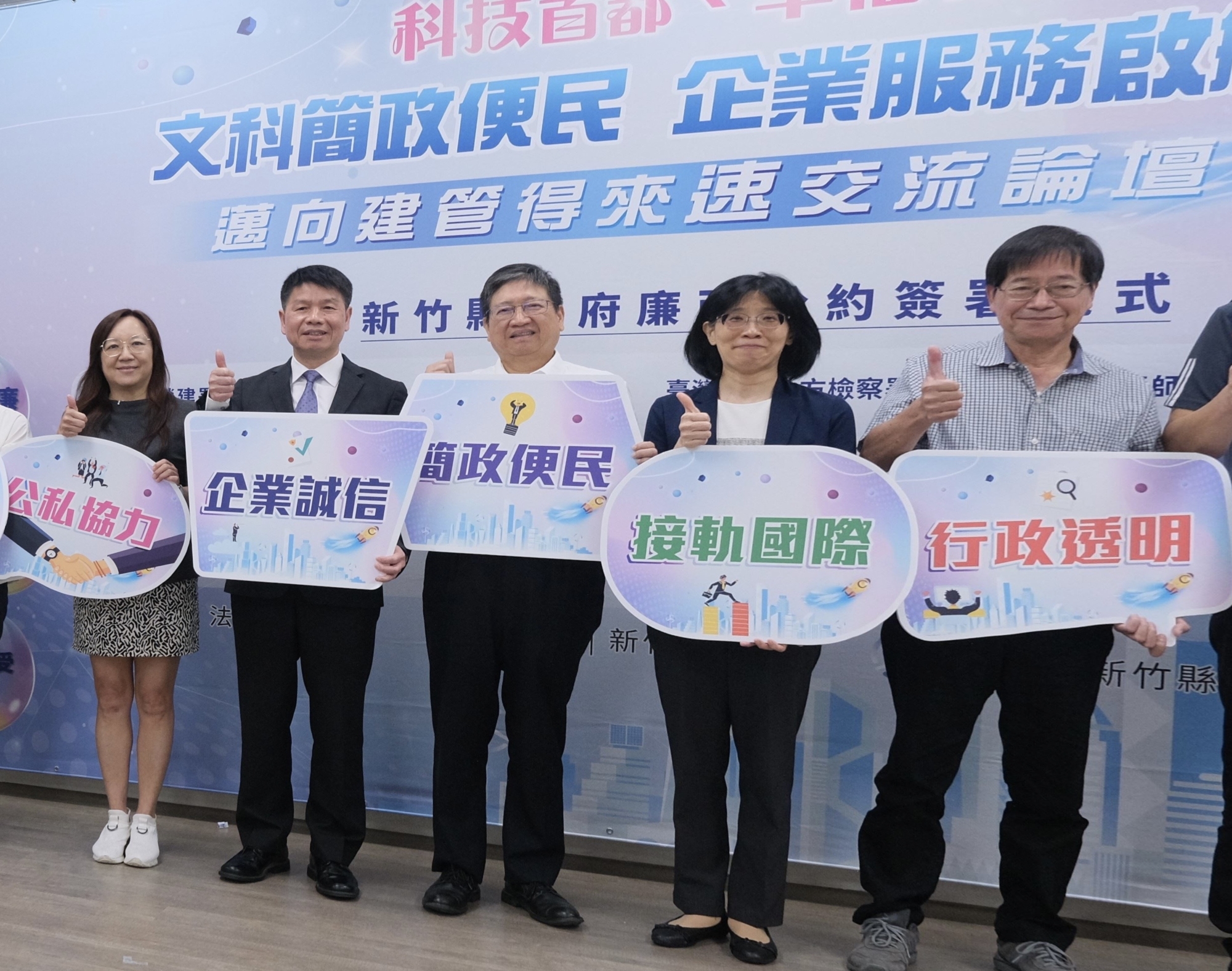竹縣政府自109年起舉辦「文科簡政便民」系列活動,持續推動簡政便民措施、提升整體行政效率,政風處與工務處今(6日)聯合辦理「文科簡政便民、企業服務啟航-邁向建管得來速交流論壇」,並由縣長楊文科與臺灣新竹地方檢察署、法務部廉政署、內政部營建署、新竹縣建築師公會及新竹縣不動產開發商業同業公會等單位,共同進行新竹縣政府廉政公約簽署儀式,宣示守護新竹縣廉潔環境。