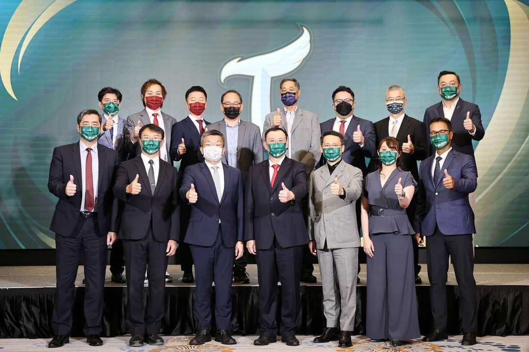 中華職棒聯盟會長蔡其昌與台鋼集團會長謝裕民及相關人員,參與職棒第六隊台鋼雄鷹加盟簽約儀式。