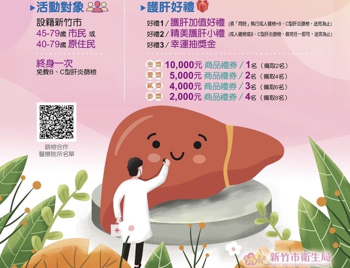 響應7月28日世界肝炎日,市府今(9)日在新竹市公道五市民活動中心辦理假日社區整合性健康篩檢,現場共300名市民參加,並邀請新竹國泰醫師消化內科潘之瑩醫師分享篩檢重要性。市長高虹安前往視察民眾健檢情形,並鼓勵符合免費B、C肝篩檢資格的市民,只要於11月30日前至本市合作送好禮的50家醫療院所(https://reurl.cc/94blen)進行篩檢,即可獲限量好禮,還有機會抽中最高1萬元商品禮券。
