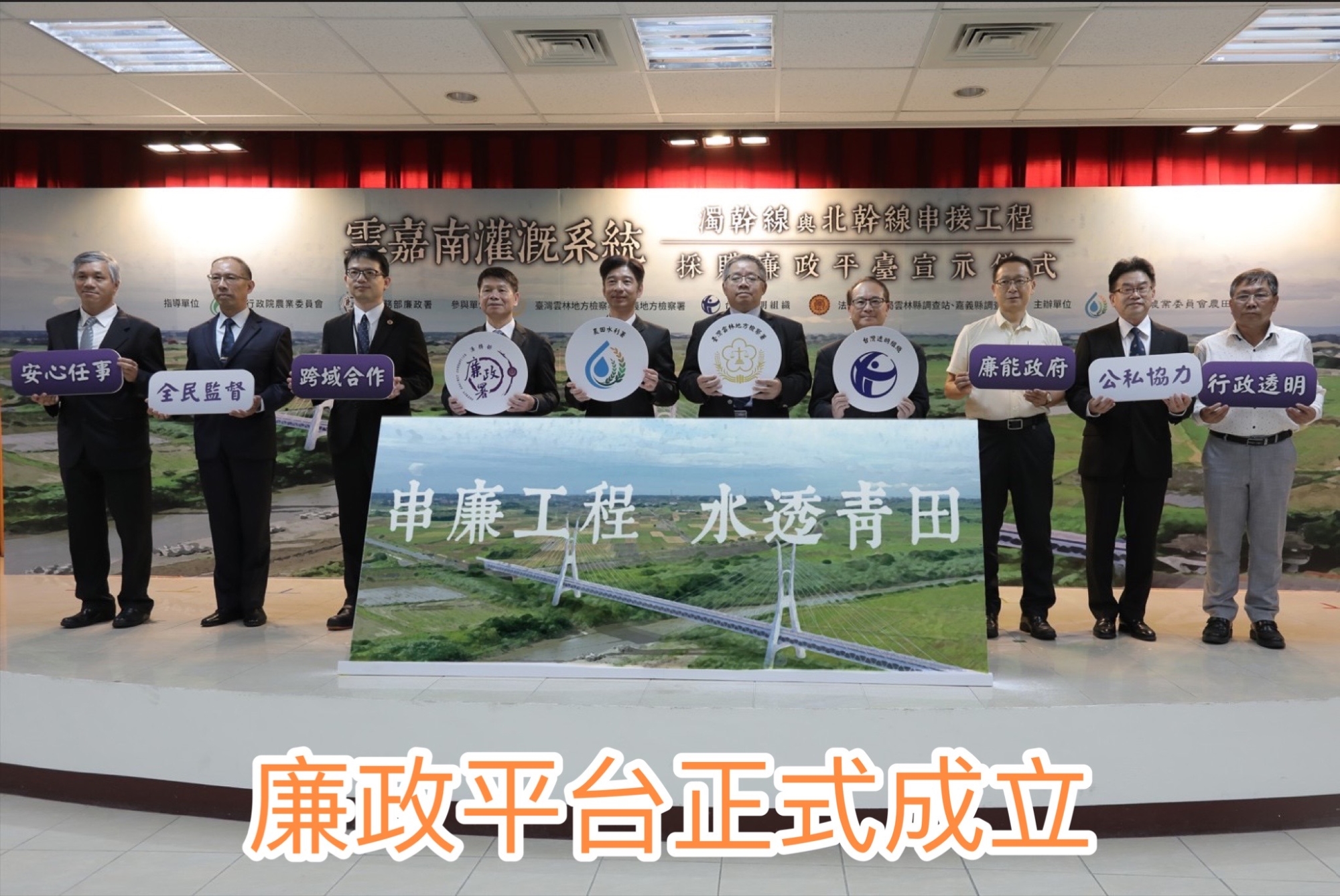 農委會農田水利署今天上午於雲林管理處舉辦了「雲嘉南灌溉系統濁幹線與北幹線串接工程採購廉政平臺」宣示儀式。該採購廉政平臺是行政院農業委員會組織體系中的首例,整合檢、廉、調、專家學者之相關策進建議及各機關、廠商等公私協力,以公開透明方式進行外部監督,發揮風險預防與全民監督力量,增加民眾對政府信賴與增強政府施政之有感度。