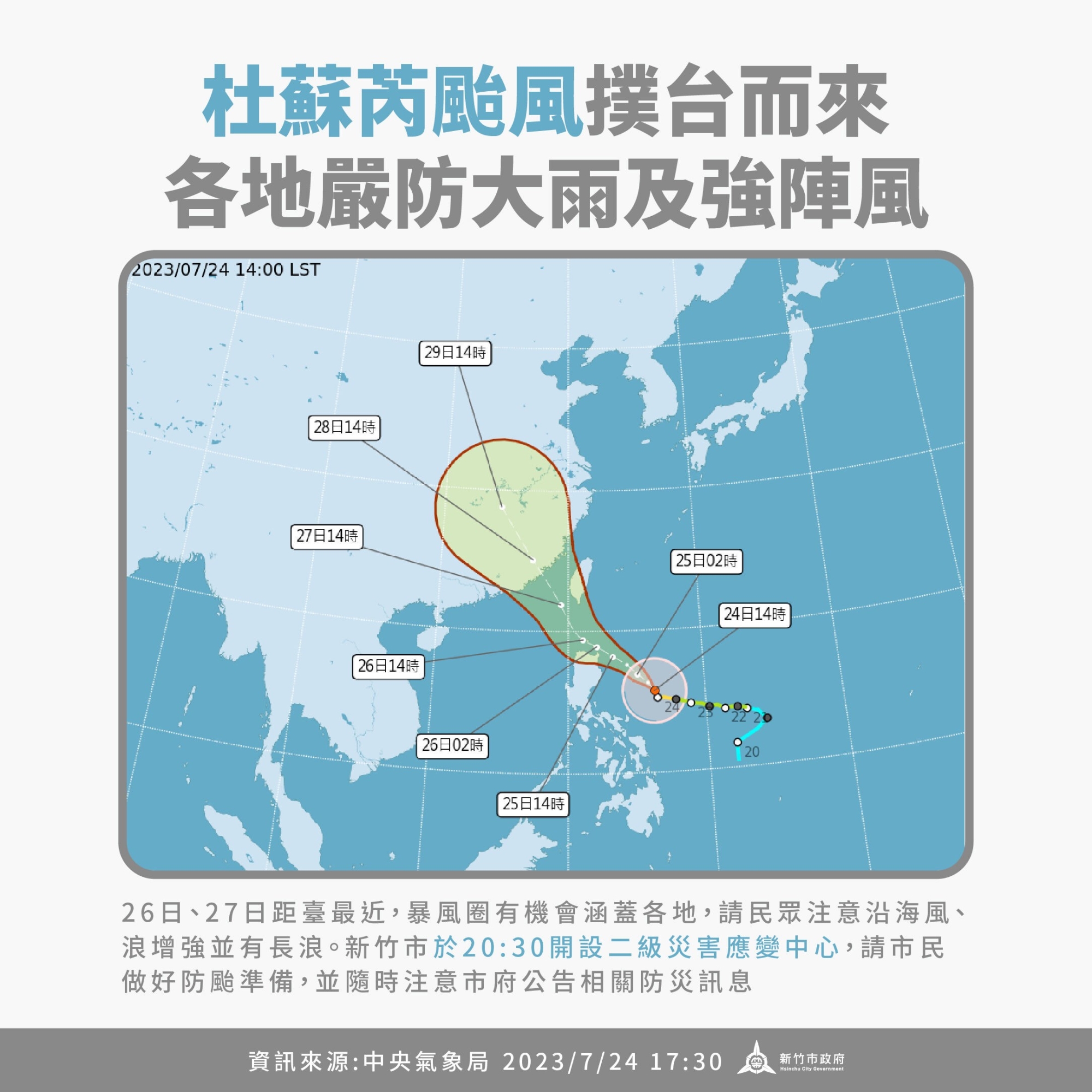 中央氣象局於今(24)日晚間8時30分發布第5號中度颱風杜蘇芮海上颱風警報,預估本週三起對新竹市帶來風雨。