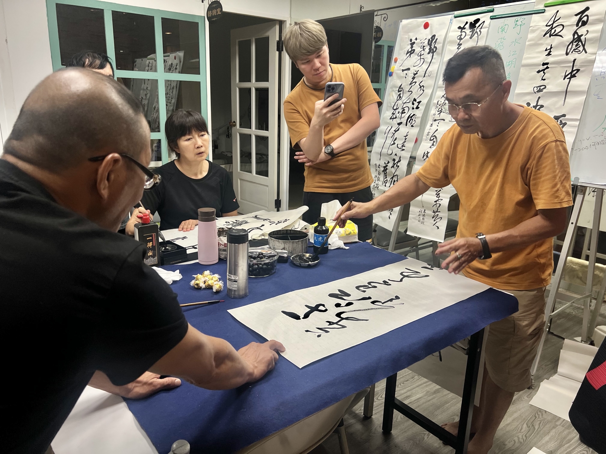 開班傳授書法,相當重視要求同學們學習心情,提醒在學習過程中心情一定要舒暢,教學環境必要自然舒適,讓同學們隨心所欲下筆,再一一從旁指導,除了基本要求起、行、收三運筆外,進一步藝術技巧如長短、橫豎、正斜、縱橫、轉折粗細、方圓、曲直,也隨機指點,希望同學朝向書法藝術發展。