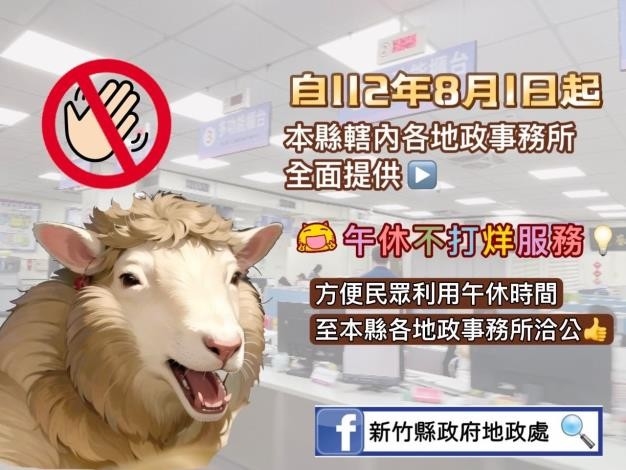 竹縣各地政事務所,全面恢復午休不打烊服務。竹縣地政處表示,為因應國內新冠肺炎疫情全面解封,並提升民眾洽公之便利性,本縣轄內各地政事務所自112年8月1日起,全面恢復提供午休不打烊服務,方便民眾利用午休時間至本縣各地政事務所洽公。
