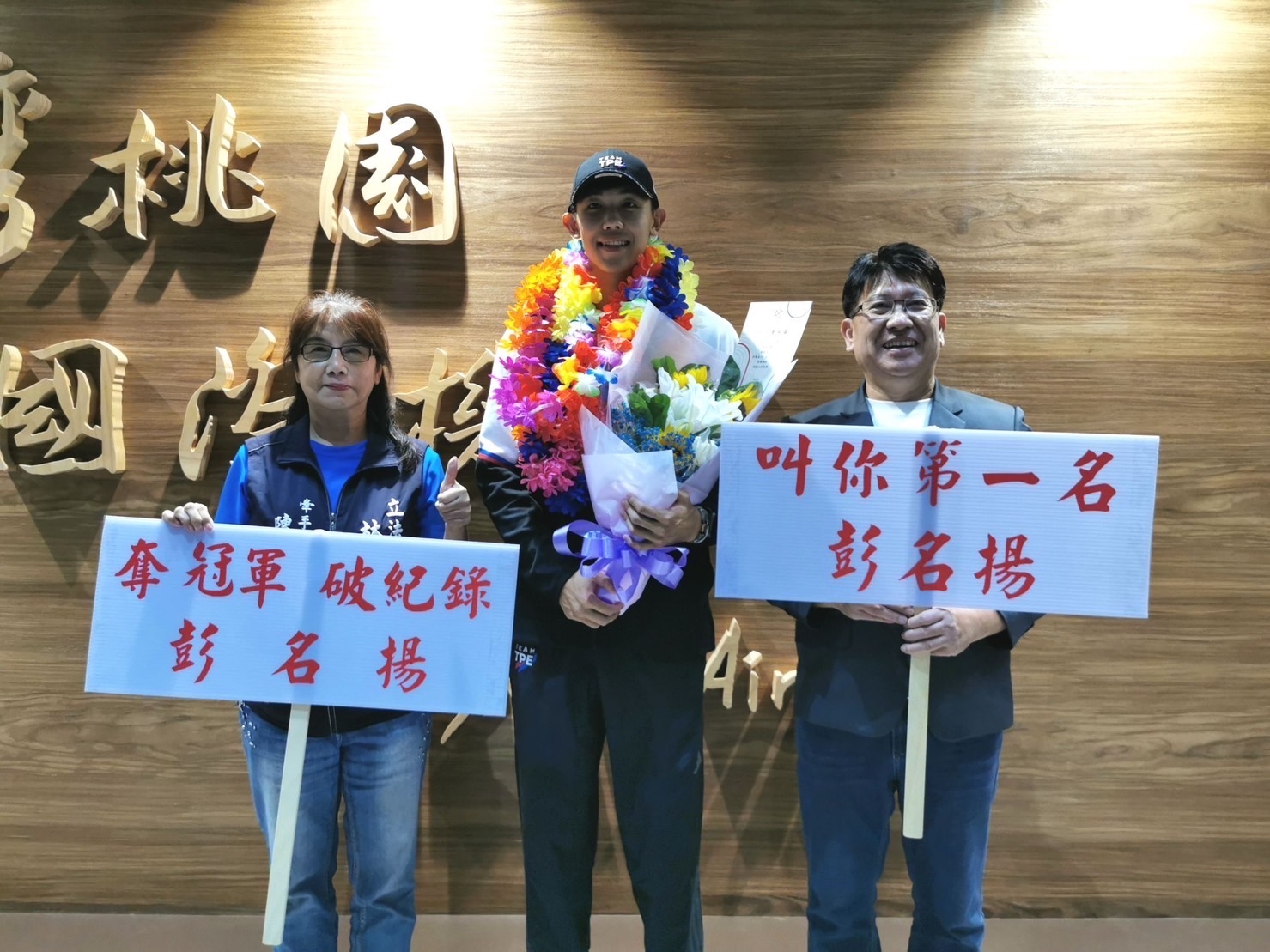 在成都世大運摘下男子400公尺跨欄金牌的竹縣體育健將彭名揚,今天傍晚搭機返台,立委林思銘與彭名揚的父親彭煥樹、親友專程前往機場接機。林思銘表示,他代表竹縣鄉親們歡迎竹東飛毛腿彭名揚載譽歸國,與感謝他把新竹、台灣的名聲帶到國際上。