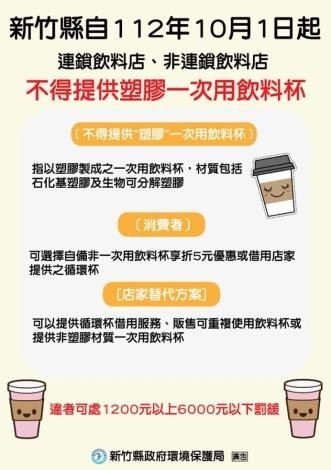 竹縣配合環保署擴大執行限塑政策,轄內飲料店將自今年10月1日起,不得提供塑膠一次用飲料杯,改以非塑膠材質一次用飲料杯、循環杯借用服務或販售可重複使用飲料杯,縣府環保局將不定期稽查,違規者將依廢棄物清理法第51條第3項規定告發,最高可處6000元罰緩,並得按次連續處分,期望業者善盡保護環境責任,加速源頭減塑。