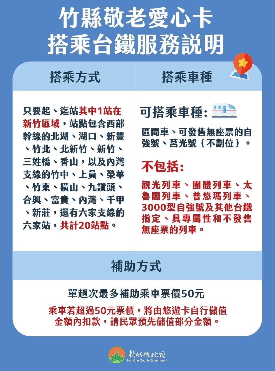 社會處說,這次祖父母節活動,長輩們(65 歲以上長者、55 歲以上原住民)使用敬老愛心卡搭乘台鐵,只要起、迄的其中一站在新竹縣轄內,單趟次最多補助乘車票價50元,敬老愛心卡整合悠遊卡,其它車資差額由悠遊卡錢包內儲值金額支付!