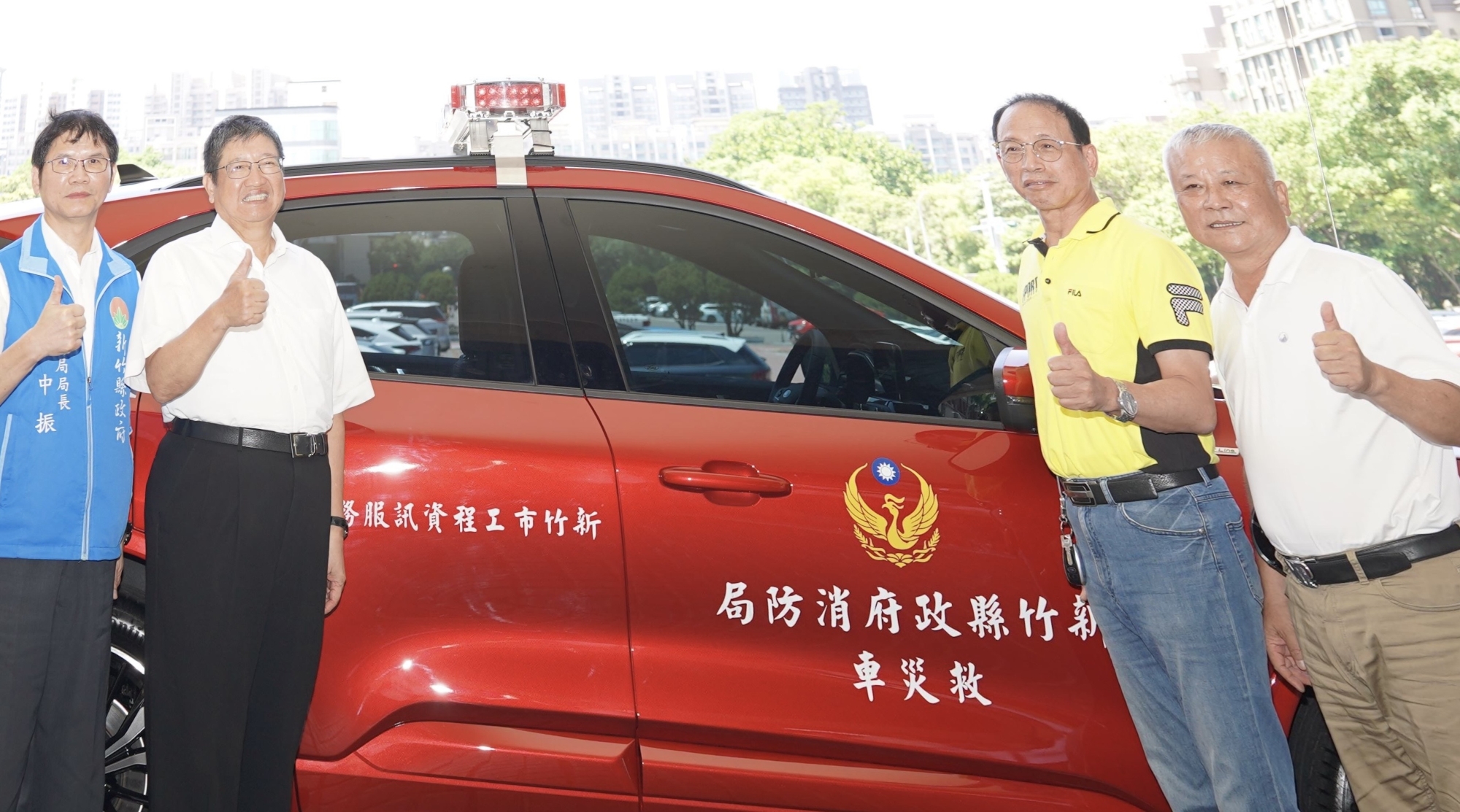 縣長楊文科特別感謝何淦銘穿針引線促成捐車,帶動社會善心服務,讓他內心感動不已說,這輛救災車將配發到第一大隊新豐分隊,提升新竹縣沿海地區的救災能量。