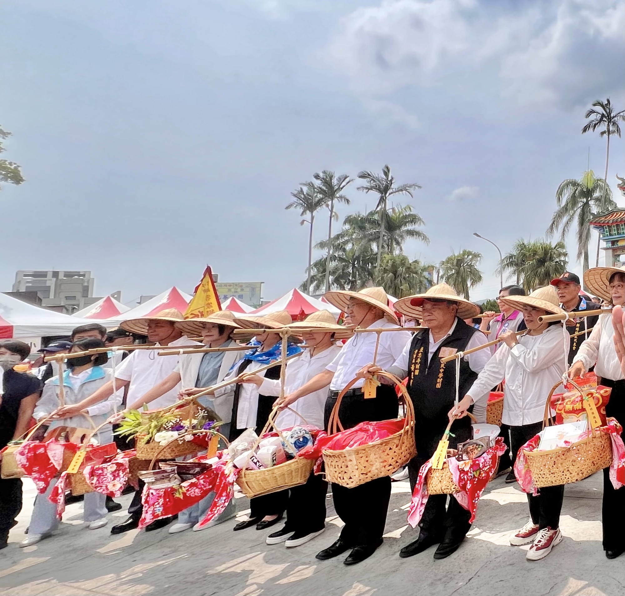 八縣市首長挑起各縣市特色「商圈特產」,參與「擔擔相傳.代代傳」的挑擔祈福儀式,步行至廟前廣場,最後楊縣長及中臺灣首長、義民廟董事長林光華、五分埔祭典區總爐主陳世偉等人,一同上香向義民爺祈福,祈求國泰民安、風調雨順;楊縣長致贈義民文創品平安符給七縣市首長,感謝大家一同共襄盛舉。