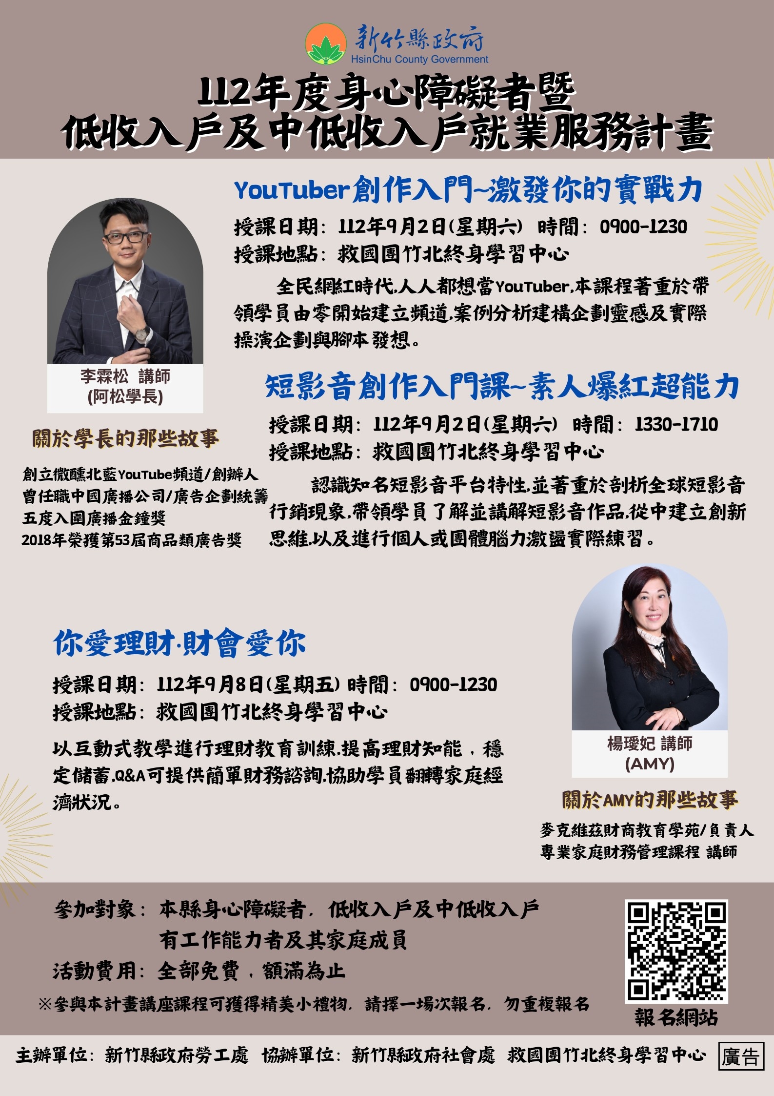 為增加新竹縣弱勢家庭成員就業競爭力及多元專業知能的機會,新竹縣政府勞工處今年特別推出身心障礙者暨低收入戶及中低收入戶就業服務計畫,將於9月2日、8日舉辦3場限定講座,邀請網紅YouTuber、廣播金鐘獎得主的「阿松學長」李霖松開講如何運用短影音創作,還有理財專家楊璦妃講述如何提高理財知能,翻轉家庭經濟狀況,歡迎新竹縣身障者、低收入戶及中低收入戶家庭成員踴躍報名參加。
