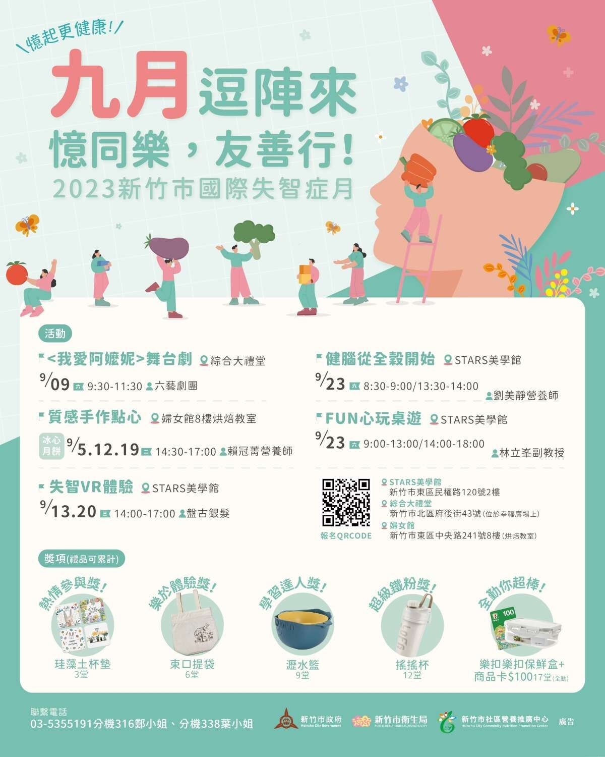 響應9月國際失智症月!新竹市衛生局推出「逗陣來、憶同樂、友善行!」趣味系列活動及課程,邀請市民朋友不分年齡共同關心失智議題,認識失智症並友善支持失智者,學習相關正確健康識能,活動課程即日起開放線上報名( https://reurl.cc/p6OY3Z ),名額有限、額滿為止,還有多項禮品,市長高虹安歡迎闔家大小報名參加,將預防失智症的健康行為落實於生活中。