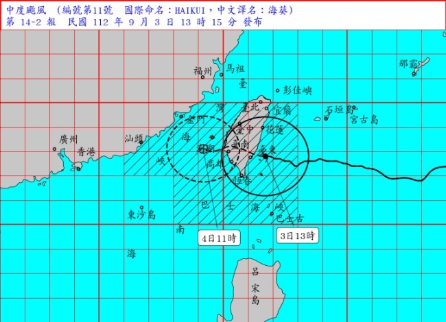 依據中央氣象局發布之中度颱風海葵海上陸上警報資料,9月3日13時颱風的中心位置在在臺東的東方約60公里之處,向西北西進行,其暴風圈已進入臺灣東半部及臺中以南陸地,對宜蘭、花蓮、臺東、新竹以南地區、恆春半島及澎湖構成威脅。