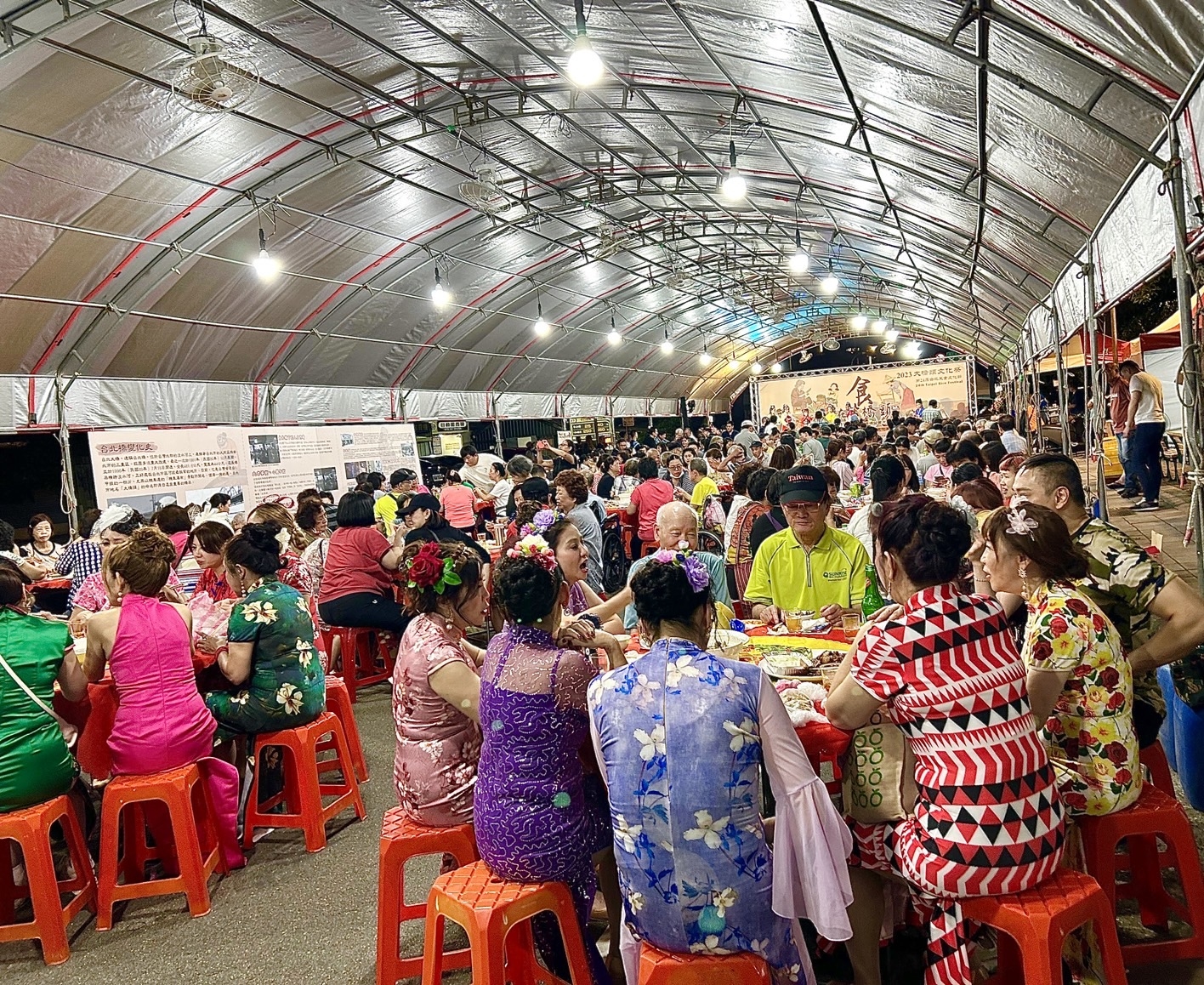 「2023大橋頭文化祭」也特地還原古早年代的「戲棚下辦桌」,計有300人上桌,每一桌都有「米食大觀園」裡五顏六色的粿,每一道菜都是大橋頭在地總鋪師的手路菜,大家一邊享受美食,一邊欣賞趣味十足的「橋頭歌廳秀」、傳統歌仔戲表演,以及難得一見的「亞太旗袍文化聯合會台灣總會」所帶來的旗袍走秀,將現場氣氛炒熱到最高點。