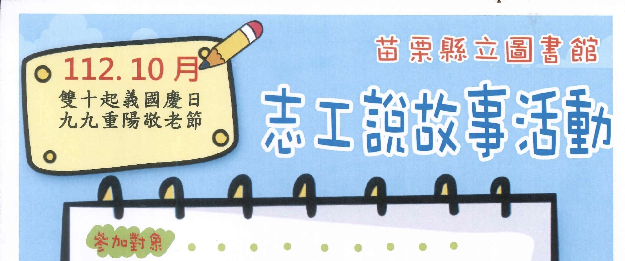 苗栗縣立圖書館於112年10月特規劃關於節慶的志工說故事活動,共計13場次,包括:《Flying Colors國旗的故事》、《重陽節:遙知兄弟登高處》、《大魔王與無敵神劍:重陽節的故事》、《阿比毋記得麼个?》、……等。