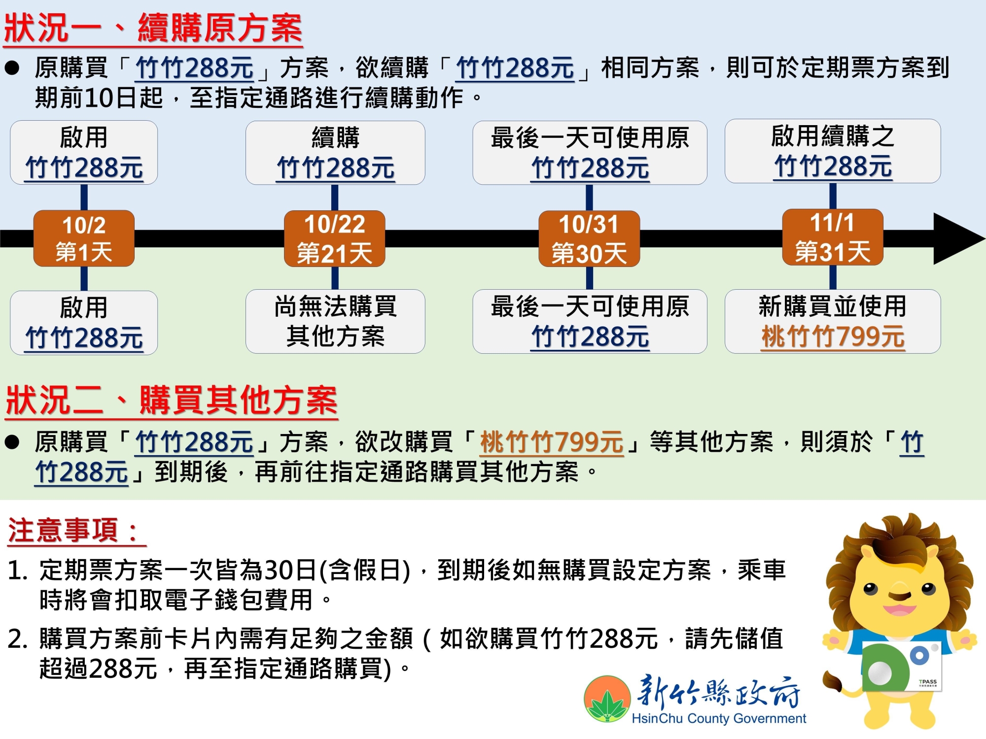 交旅處也提醒民眾,如需續購原方案可於定期票到期前10日內進行續購,如欲改買其他方案,則需等定期票到期後才能轉換其他方案,有關「桃竹竹苗通勤定期票」相關使用須知、適用路線,可至新竹縣政府交通旅遊處網站查詢