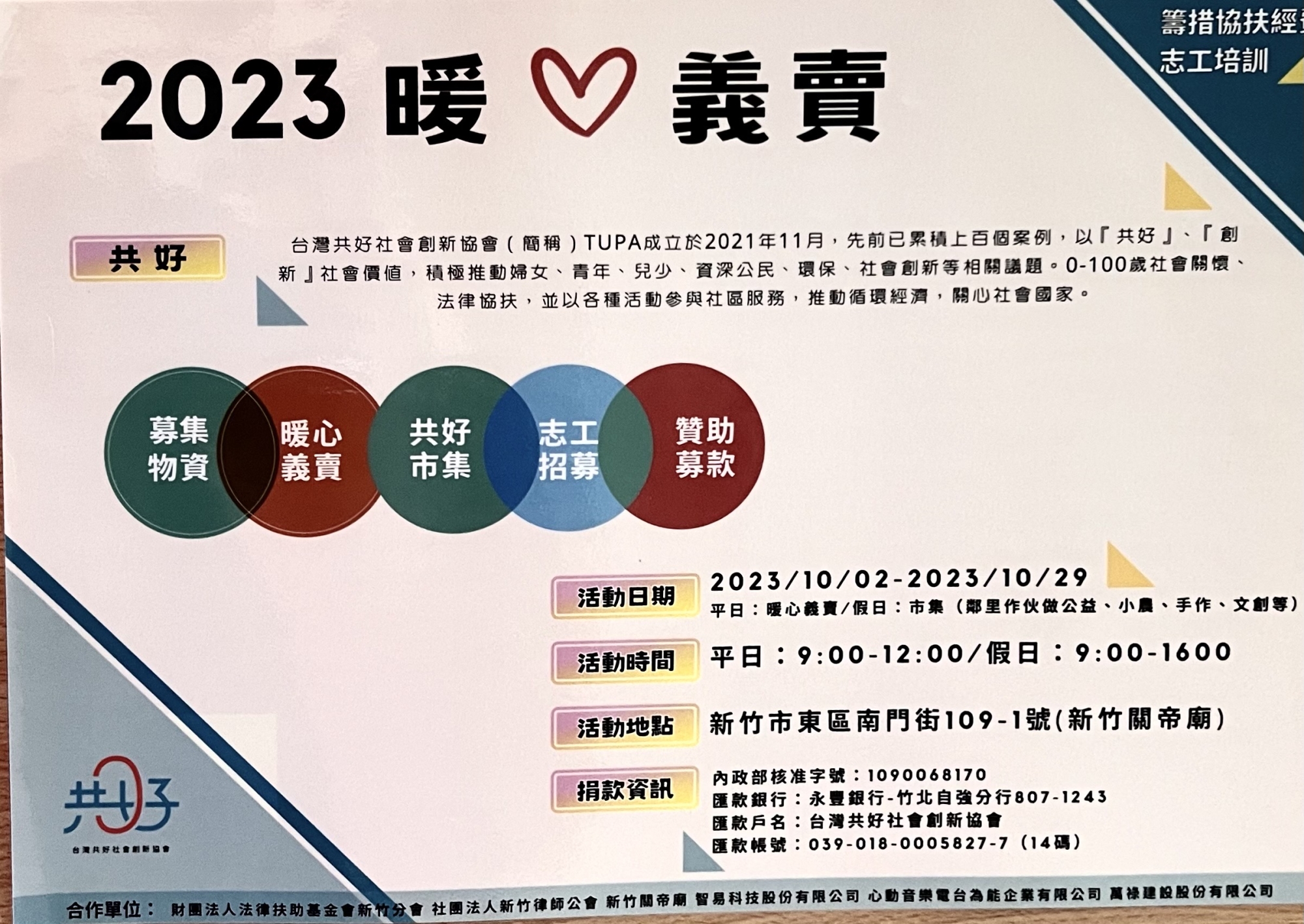 2023暖心義賣,為「共好協會」與財團法人法律扶助基金會新竹分會、社團法人新竹律師公會、財團法人新竹關帝廟文教獎學基金會共同合作。