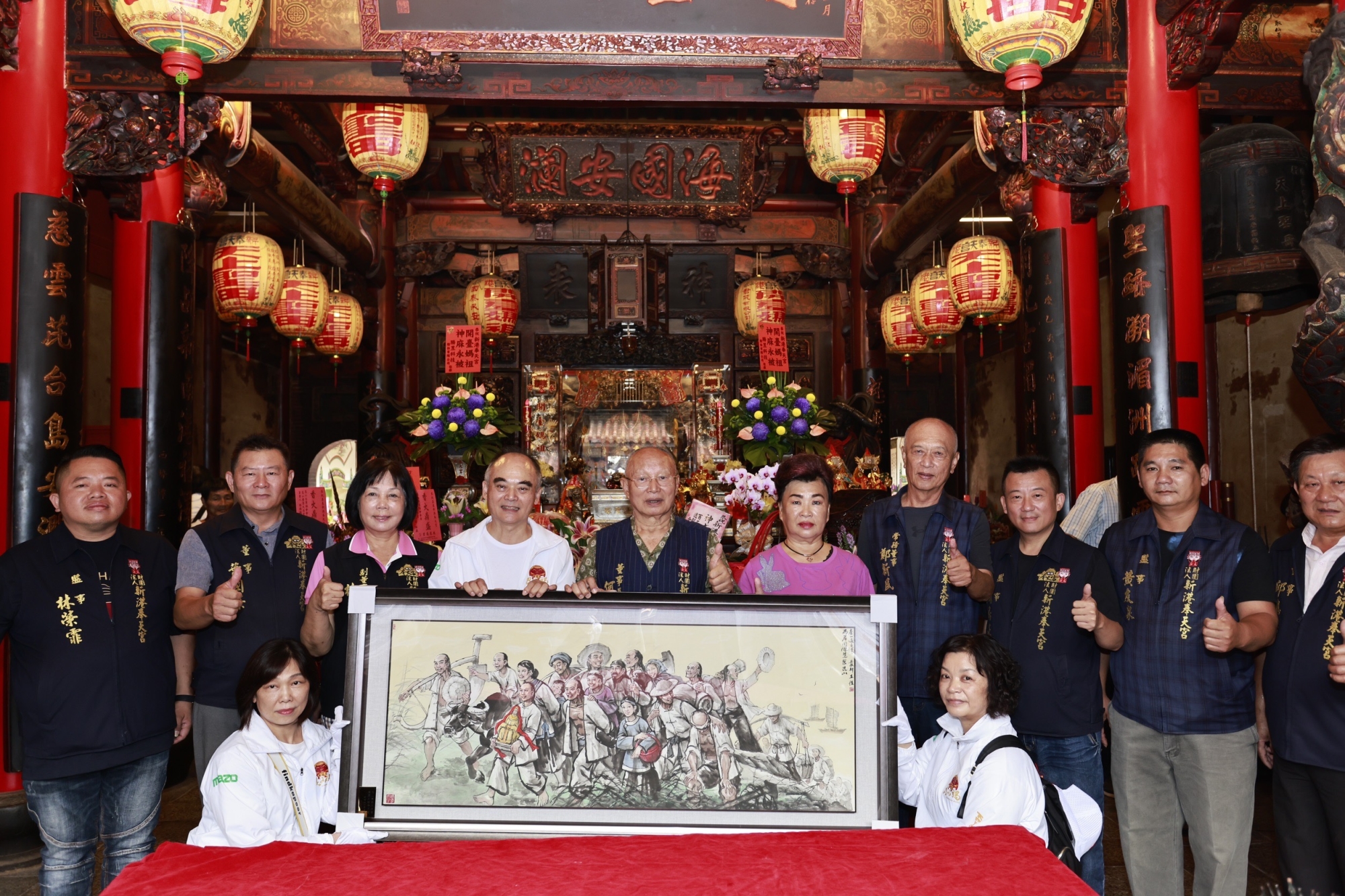 昆山台商協會會長、慧聚天后宮負責人孫德聰(後排左四)代表致贈姊妹廟奉天宮「唐山過台灣」畫作。(慧聚天后宮提供)