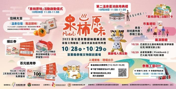 苗栗縣政府文化觀光局首次與苗栗縣泰安鄉公所共同舉辦溫泉季X泰安甜柿推廣活動,訂於112年10月28、29日於苗栗縣泰雅原住民文化產業區(苗栗縣泰雅文物館)辦理,誠摯邀請大家來泰安泡湯、嚐美食、賞山林美景,進行一場療癒身心的旅行。