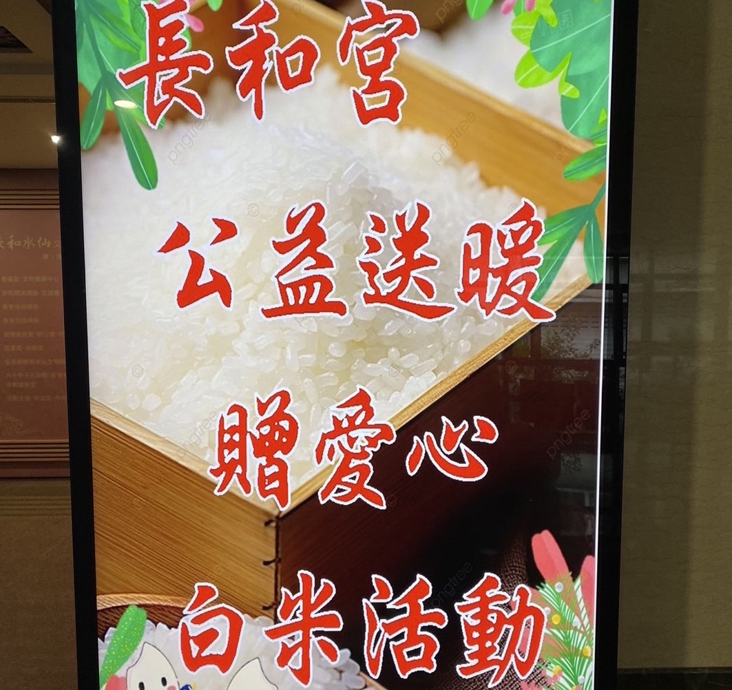 寺廟發放救濟品,總是出現天下苦人多的長龍隊伍。長和宮主任委員楊金土說,對貧苦救濟方式很多,其中以發白米機率比較高,但還是有一定數量和時間,有規範不會出現行善善待埋怨憾事。
