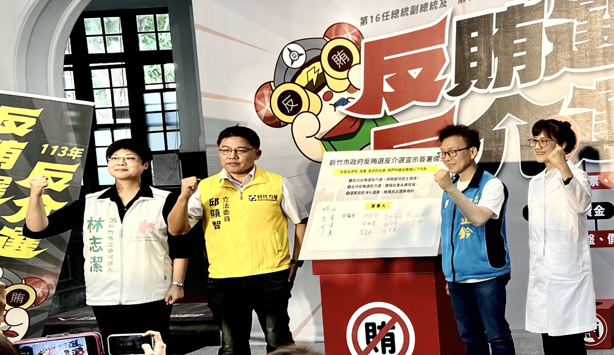 下屆竹市立委參選人,已經出現在台面上的林志潔、邱顯智、鄭正鈴和柯美蘭四人,在今(10)日於市府舉辦反賄選、反介選宣示儀式,首次一塊露面出現在眾人眼前,為了目前四搶一局勢,各有個的盤算不同神情。