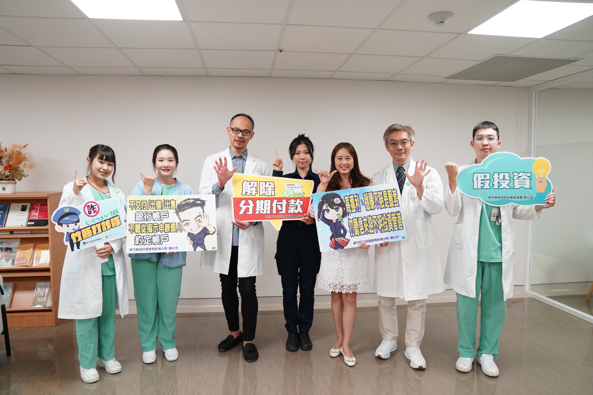 詐騙手法日新月異,新埔警分局為擴大識詐成效,與中國醫藥大學新竹附設醫院合作拍攝宣導影片,邀請執行長張宜真、放射腫瘤科主任郭于誠、核醫科主任張宇捷及護理師等接受員警「嚴刑拷打」,測試醫護人員防詐知識夠不夠,測驗結果,醫護同仁果然有練過,通通答對,藉由生動活潑影片內容,將防詐觀念散播出去。