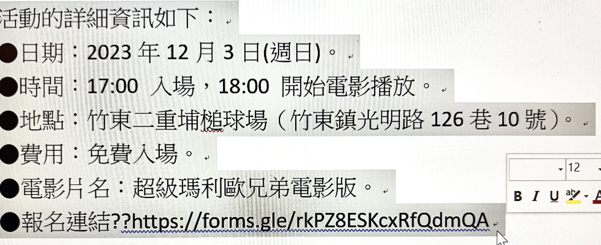 立法委員林思銘競選總部12月3日(週日)傍晚,將在竹東二重埔槌球場舉辦一場別開生面的免費戶外電影夜活動,除了播映最新的《超級瑪利歐兄弟-電影版》電影外,現場還安排魔術表演、魔法氣球活動、免費爆米花,以及胖卡餐車市集,歡迎大小朋友共渡歡樂週日夜晚。