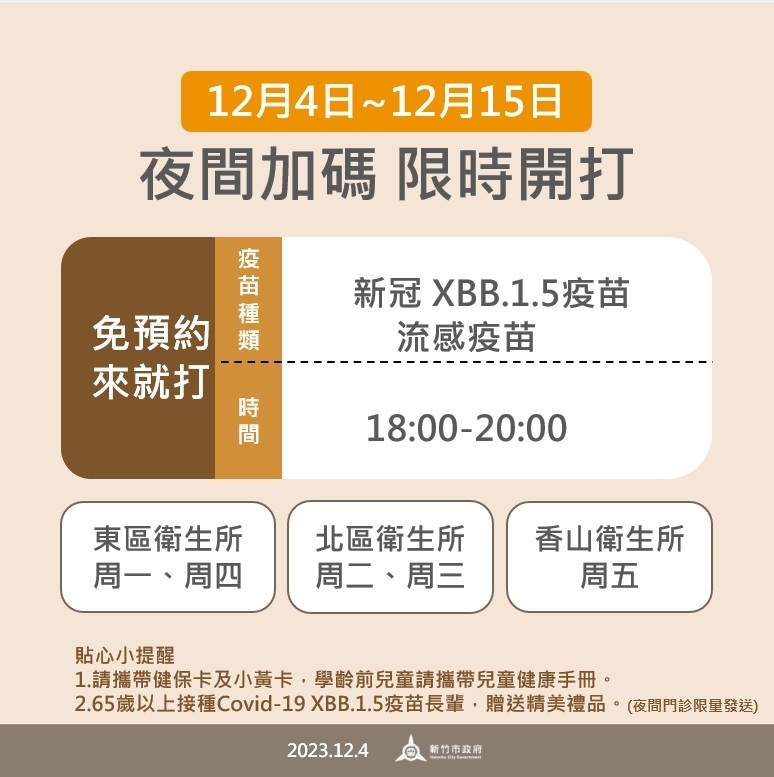 國內外呼吸道感染疫情持續升溫,且秋冬忽冷忽熱,是呼吸道傳染病好發季節,為守護市民健康及提升接種便利性,新竹市三區衛生所自今(4)日起至12月15日止,共計兩週時間,加碼開設夜間門診接種時段,提供新冠XBB疫苗及流感疫苗的接種。符合資格的市民多加利用,打疫苗保護自身健康。