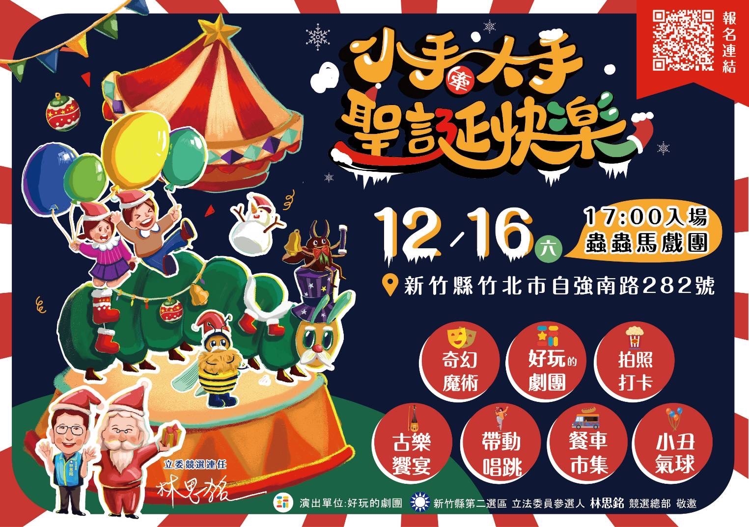 熱鬧的聖誕節快到了,立法委員林思銘邀請大、小朋友最喜歡的﹁好玩的劇團﹂,12月16日(週六)駕著麋鹿雪橇帶來蟲蟲馬戲團,在竹北競選總部提前陪大家歡度聖誕佳節。活動內容包括奇幻魔術、古樂饗宴、帶動唱跳、餐車市集、小丑氣球及劇團表演。