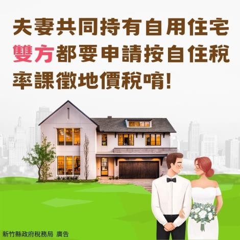竹縣政府稅務局表示:近日接獲民眾陳小姐反應,已經在9月22日前提出申請按自用住宅用地稅率(2‰)課徵地價稅,為何只有自己的部分按自用住宅用地稅率課徵地價稅,先生持有的仍按一般用地稅率課徵?