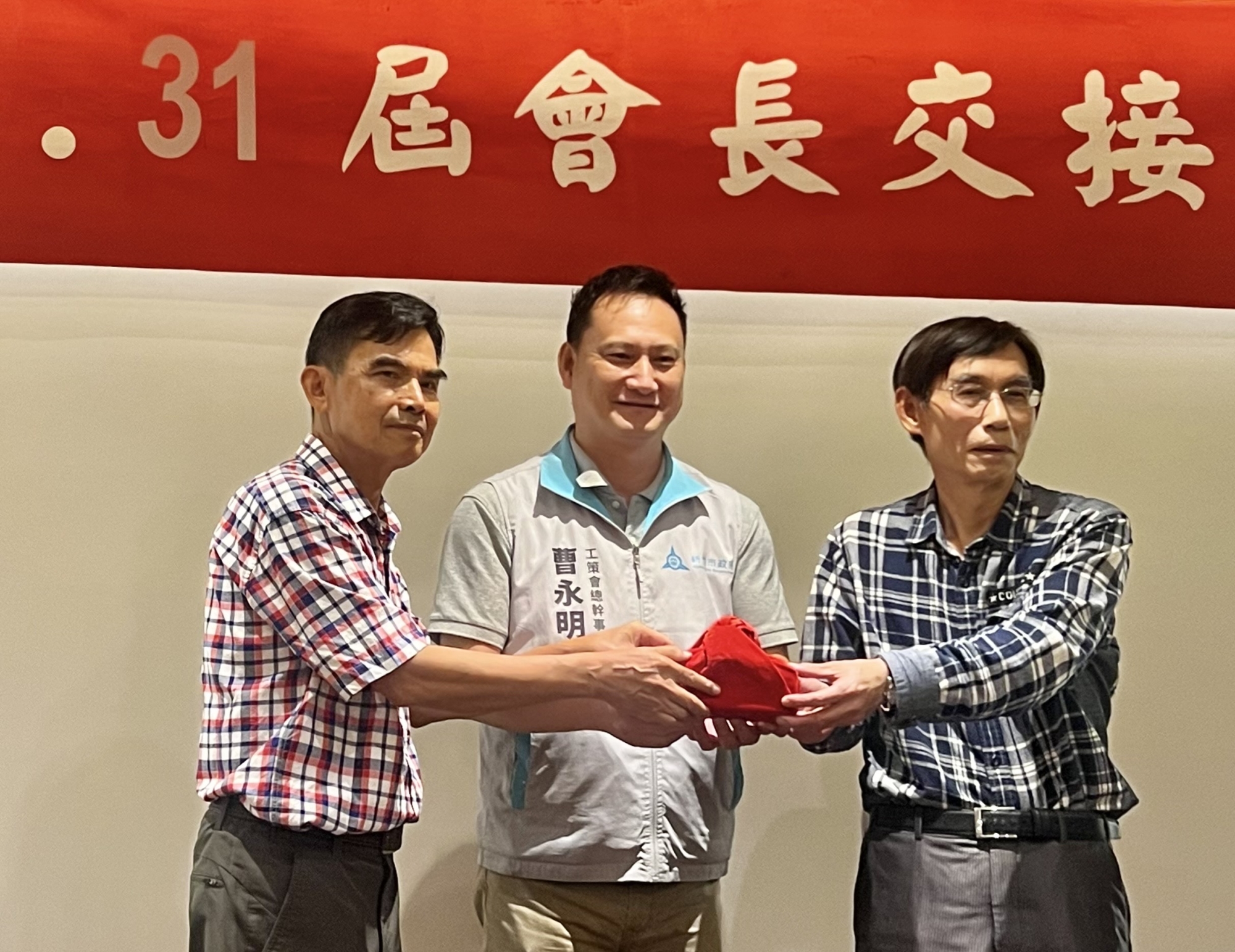 孫自強(右)和鄧琴福(左) 由竹市工策會總幹事曹永明(中)主持交接 何高祿攝