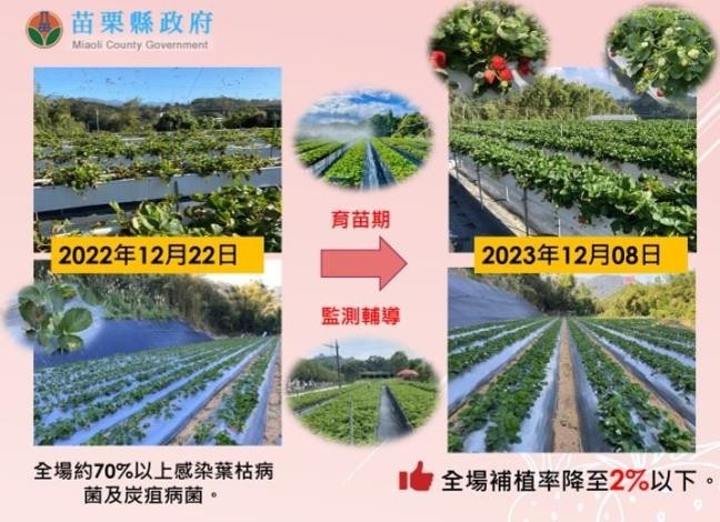 草莓近幾年因極端氣候影響,加劇炭疽病、萎凋病、葉枯病及角斑病等危害,為解決草莓定植大面積死亡問題,去年苗栗區農業改良場、農糧署及縣府農業處團隊,已積極進場損害嚴重農戶,以有害生物整合性管理(IPM)、土壤改良及與苗期輔導等,客製化方式共同輔導農友。