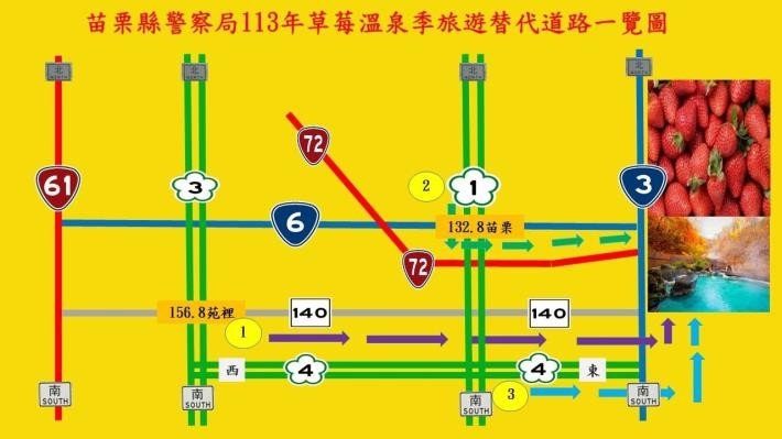 苗栗縣為全國著名觀光大縣,且鍾縣長上任以來亦持續推廣觀光旅遊及行銷優質農產品,預估本週湧入旅客可達6萬6,140車次、19萬8,421人次,自本週末起,即動員5個分局及交通警察隊約200名警力投入交通疏導及為民服務等各項工作,針對易壅塞路段加強疏導,來往草莓溫泉地區替代路線如下:
