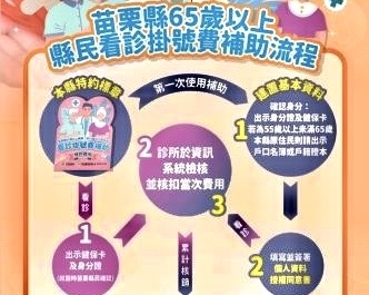 113年1月1日起65歲以上(原住民55歲以上)苗縣民前往與苗縣府簽約的診所接受門診服務,每人每次掛號費由縣府負擔50%、補助上限75元,其餘費用由簽約診所負擔,每人每年免費額度為1000元,最後一次若餘額不足,須給付差額給診所。本補助案不含為健保部分負擔、超額藥費。