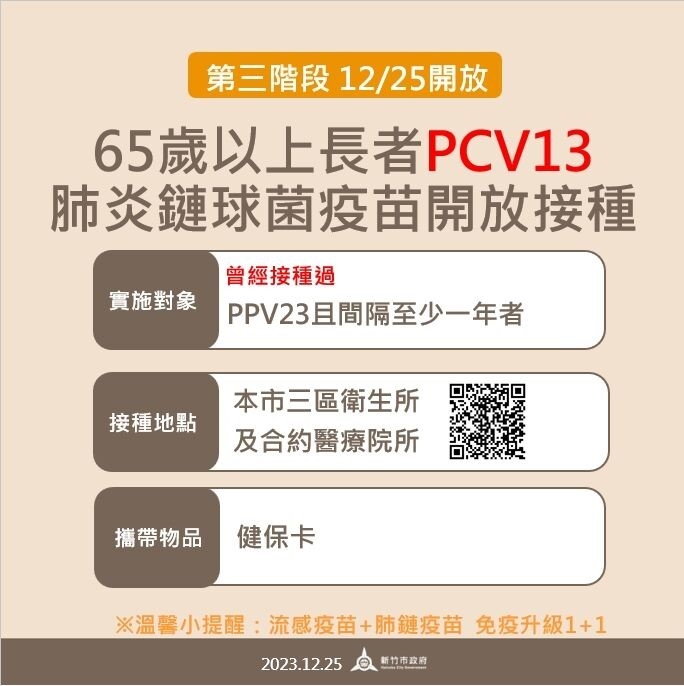 新竹市衛生局積極維護65歲以上長者健康,降低長輩因感染肺炎鏈球菌導致嚴重的併發症或死亡之機率,即日起接續執行肺炎鏈球菌第三階段接種作業,為曾接種過PPV23且間隔至少1年的長者接種PCV13疫苗。