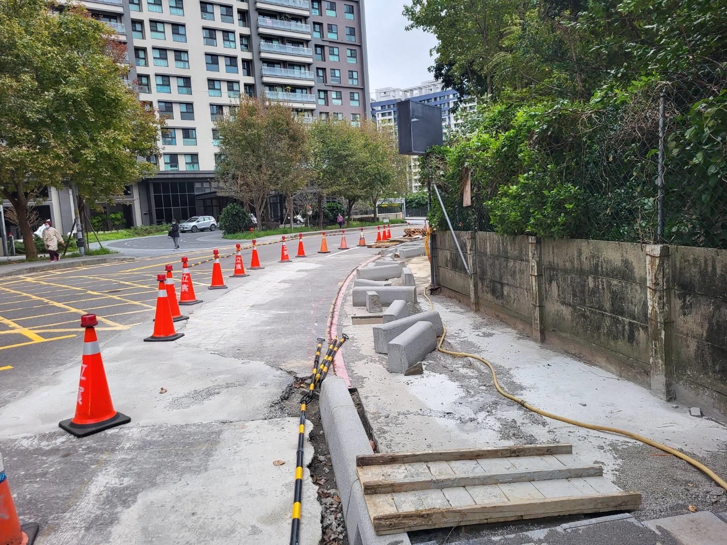 建設課陳明靖課長說,光明路126巷環宇市社區前人行道原本現況是兩側都有路肩,若需要停車就很容易停到車道上,這次就用人行道空間改善的計畫,把路肩重新做調整。在道路的設計上,愈窄的道路事故率是越低,車道越窄是越安全的,視覺上駕駛人會自動減速、機車也不容易亂鑽。