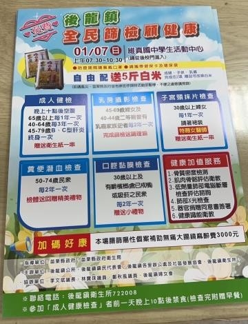 苗栗衛生局結合後龍鎮公所、後龍鎮民代表會、後龍鎮衛生所與大千綜合醫院,共同守護後龍鎮民的健康。謹訂於113年01月07日上午7點30分至10點30分於維真國中學生活動中心,共同辦理「後龍鎮全民篩檢顧健康」大型整合性健康篩檢。